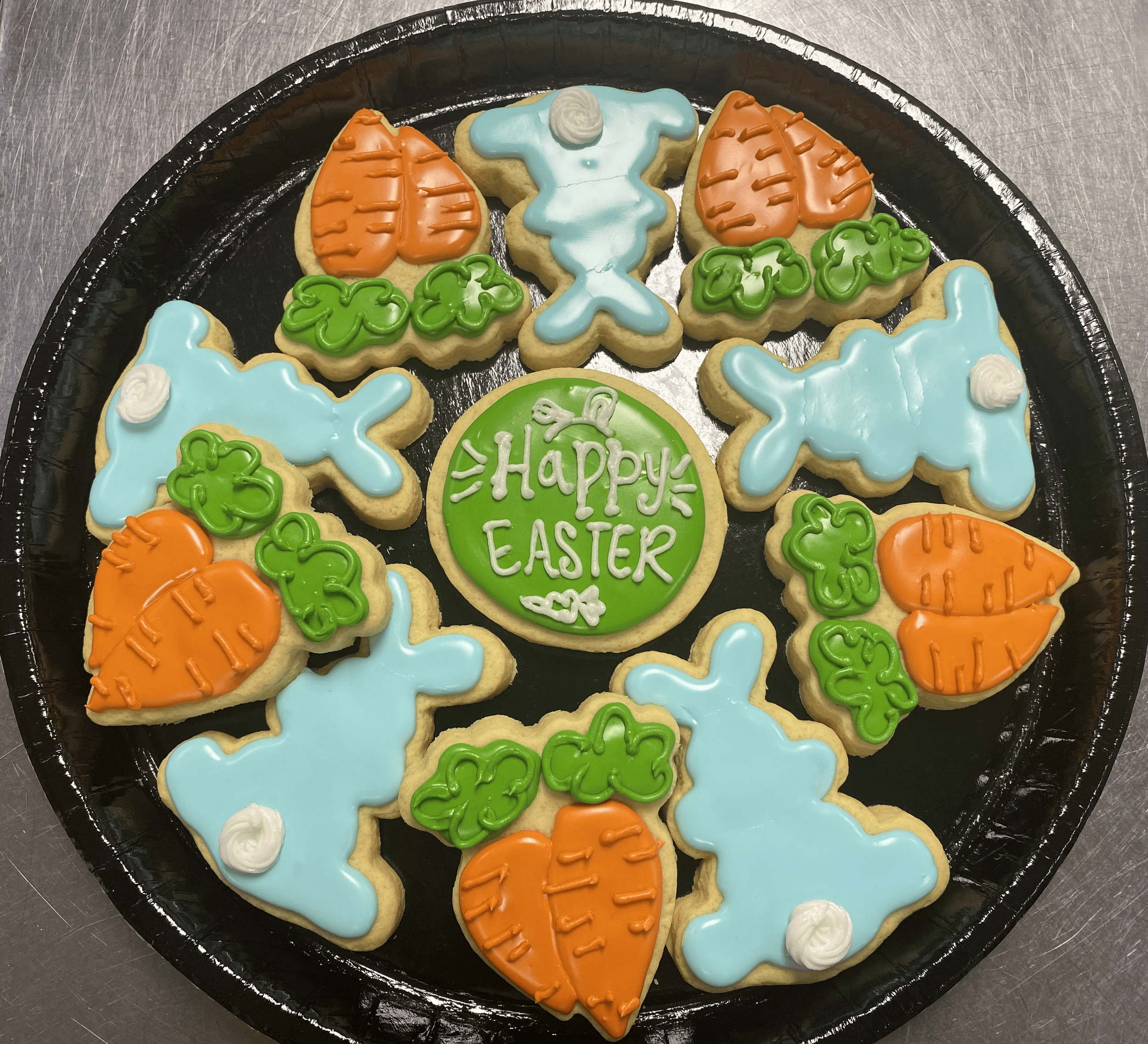 A dozen of our freshly baked iced cookies, assorted on a tray for the perfect Easter celebration!